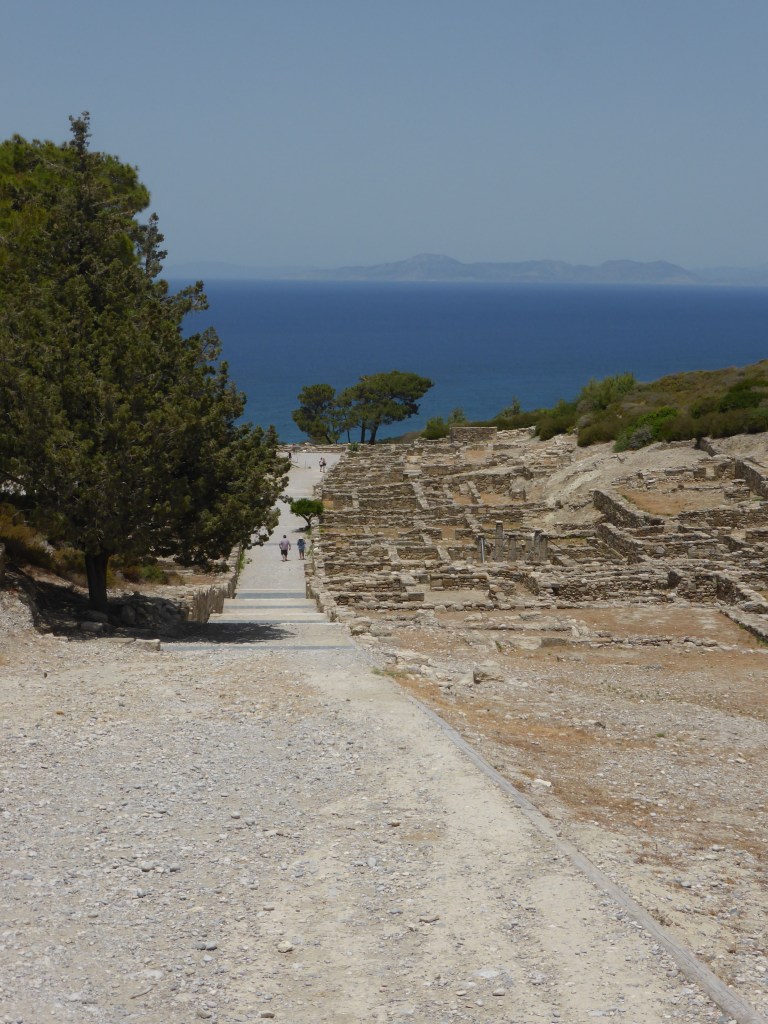 De auto werd om 9:00 bij ons hotel bezorgd. De chauffeur moest nog even zoeken naar het juiste hotel, maar toen kwam hij met een witte Hyundai aanzetten. We hadden de dag ervoor al heel wat tips te horen gekregen, wat leuk is om te bezoeken. De eerste dag hebben zijn we met de auto langs de westkust van Rhodos gegaan. We zijn richting de oude stad van Kamiros gereden. Dit is een opgraving van een oude Griekse stad, van voor Christus. De fundering van de stad is goed te zien, het licht mooi tegen de heuvel op met prachtig uitzicht over de zee. Wel is er maar weinig informatie over wat je ziet. Er zijn een paar informatieborden. Bovenin de stad zijn nog duidelijke resten te zien van een grote langwerpige tempel. Als je naar beneden loopt vind je enkele funderingen van woningen. Aan het einde vind je nog meerdere badhuizen en een andere tempel. Het is leuk als je nog nooit een oude Griekse stad of opgraving hebt gezien, maar er zijn nog mooiere plekken in de rest van Griekenland. Hiervoor moesten we €6 p.p. toegang betalen. Heel veel meer is het ook niet waard.